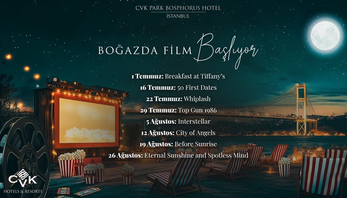 CVK Park Bosphorus Hotel’in Teras katında; 1 Temmuz’dan itibaren, her Salı akşamı Cenk Caner küratörlüğünde gerçekleşecek olan “Film Gibi Akşamlar”etkinliği şehrin kalabalığından uzaklaşmak ve sinemayı yeniden hissetmek isteyenler için benzersiz bir fırsat sunuyor. Bu özel film serisinde, ikonik yapımların büyülü dünyasına dalarken, patlamış mısır eşliğinde keyifli sohbetler edilecek, Alaska Frigo sürpriziyle çocukluk anıları tazelenecek.